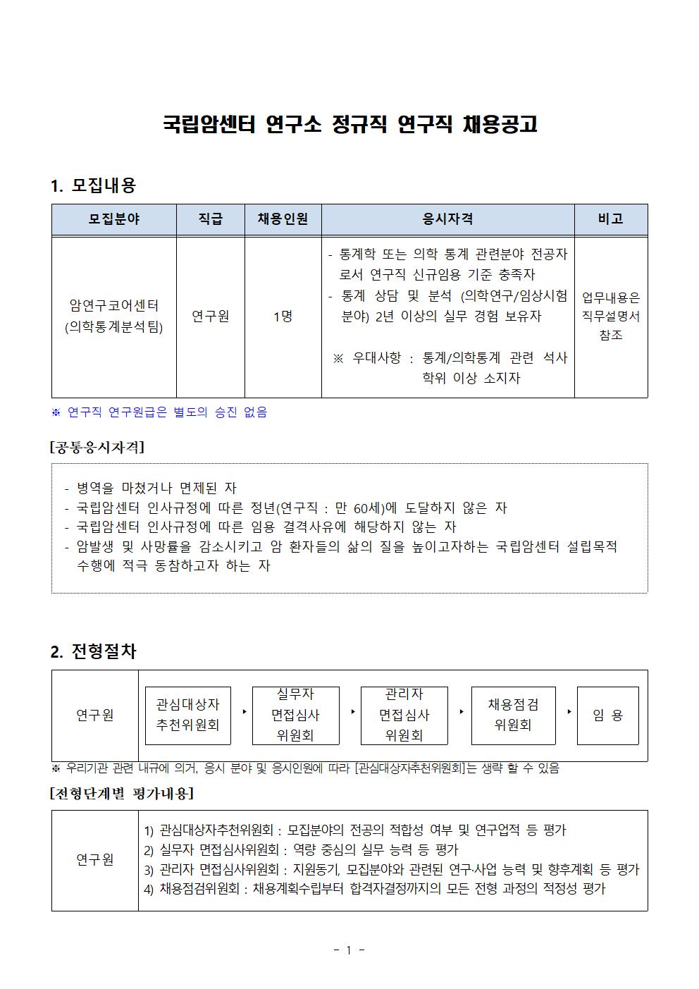 | [국립암센터] 연구소 정규직 연구직 채용공고 (연구원급) (0) | 2024.04.01 |