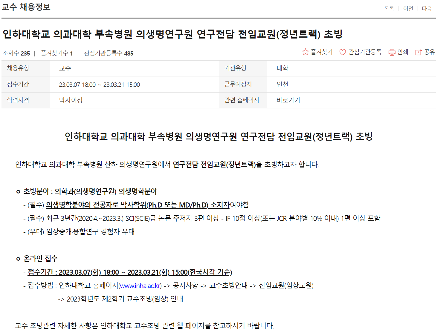 | [인하대학교] 2023년 3월, 신임교원(정년트랙) 채용, 빅데이터/인공지능 (0) | 2023.03.09 |