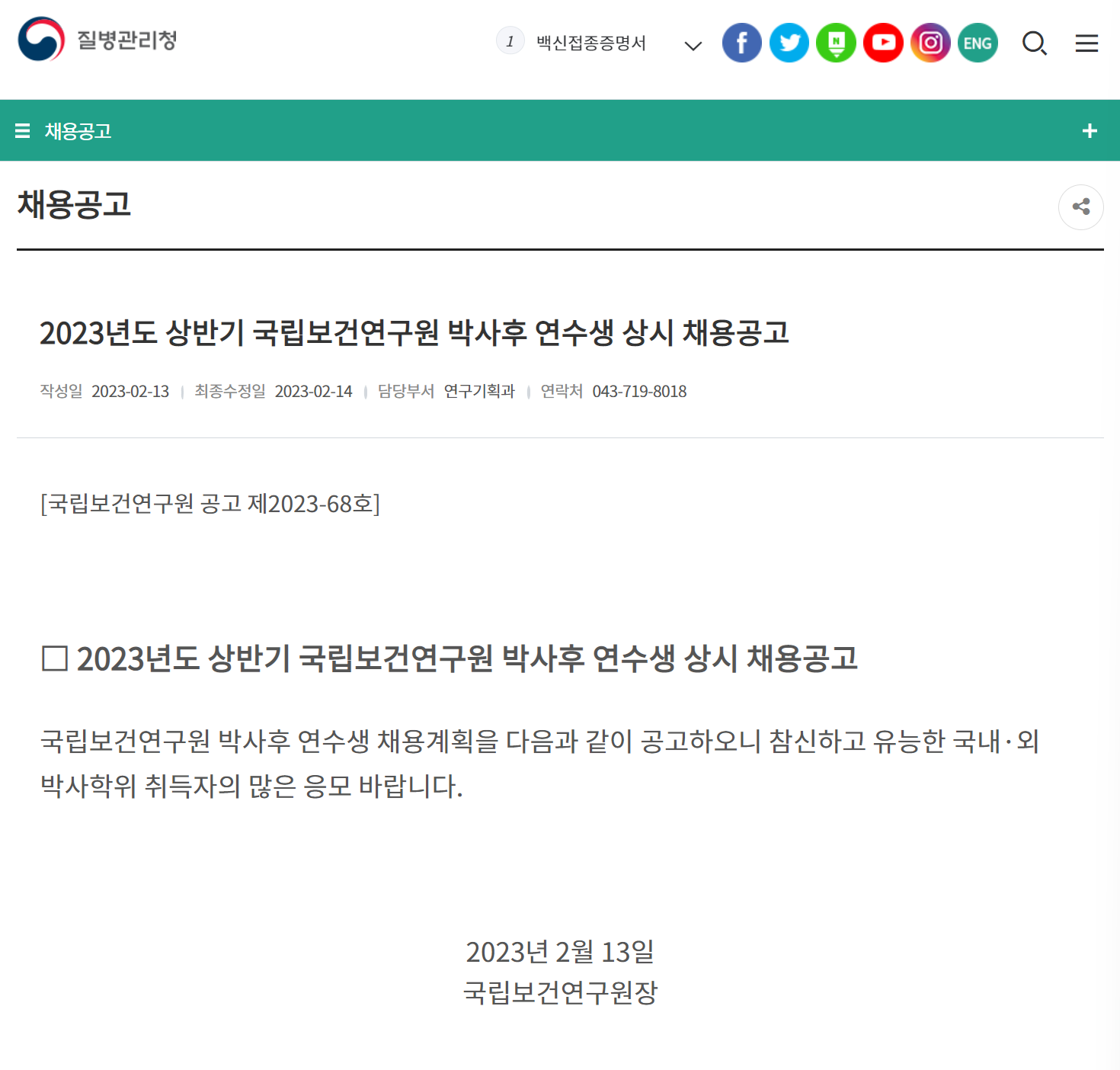 | [한국생명공학연구원] 2023년 3월, 연구부분 (연구직) 공개채용 (대전) (0) | 2023.03.03 |